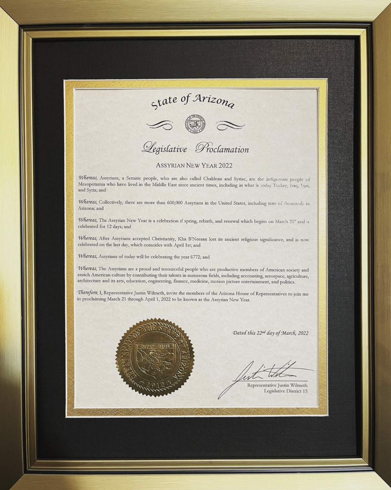 A proclamation issued by State Rep. Justin Wilmeth in the Arizona House of Representatives formally recognizes the Assyrian New Year in the state of Arizona. We join with Assyrian-Americans in Arizona in commending the Assyrian American Cultural Organization for their leadership in promoting the cultural importance surrounding the observance of the Assyrian New Year. From Rep. Wilmeth's proclamation: "The Assyrians are a proud and resourceful people who are productive members of American society and enrich American culture by contributing their talents in numerous fields, including accounting, aerospace, agriculture, architecture, and its arts, education, engineering, finance, medicine, motion picture entertainment, and politics."