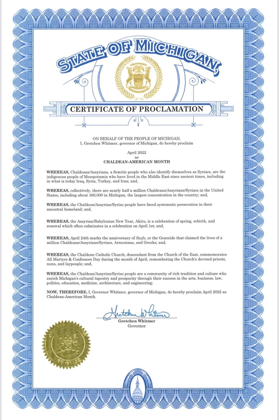 Michigan Governor Gretchen Whitmer issued a proclamation declaring April 2022 as Chaldean-American heritage month, noting "the Chaldean/Assyrian/Syriac people are a community of rich tradition and culture who enrich Michigan's cultural tapestry and prosperity."